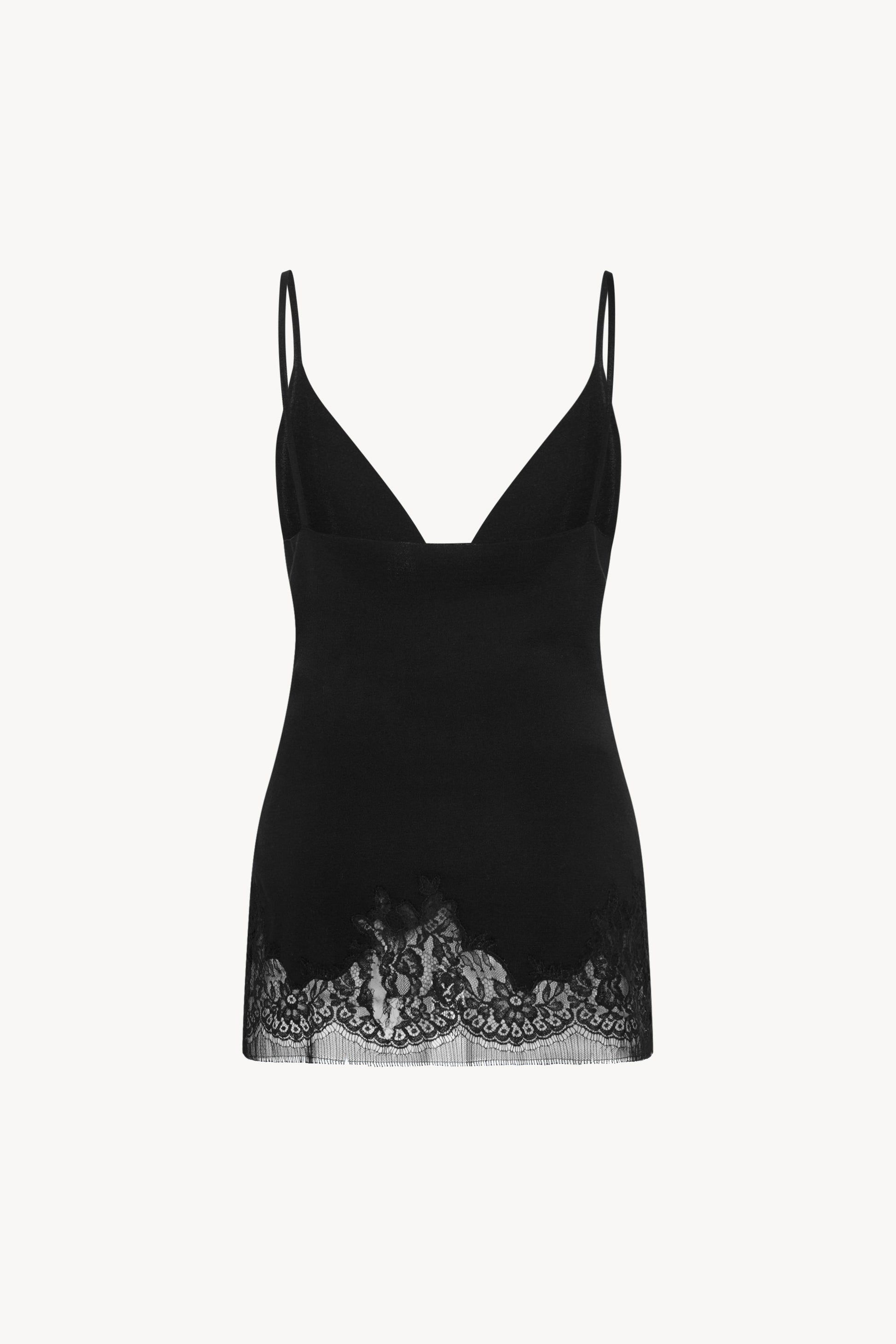 Fitted camisole top in fluid silk with slim straps, v-neckline, and tonal lace embroidery at hem.